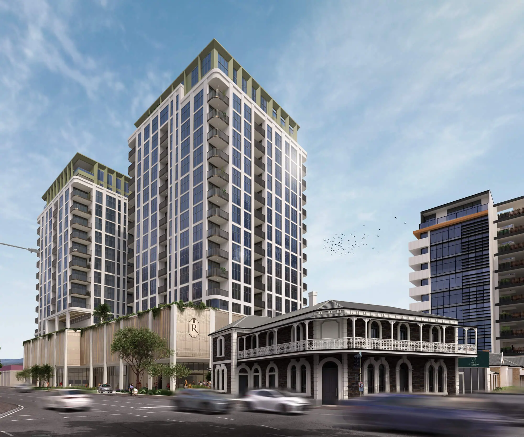 Royal Apartments represents our newest residential development in Adelaide—two towers positioned directly on North Terrace at Kent Town, where the city meets Adelaide's celebrated parklands. The project comprises 1, 2, and 3 bedroom residences plus penthouses across 15 levels, with commercial opportunities at ground level.